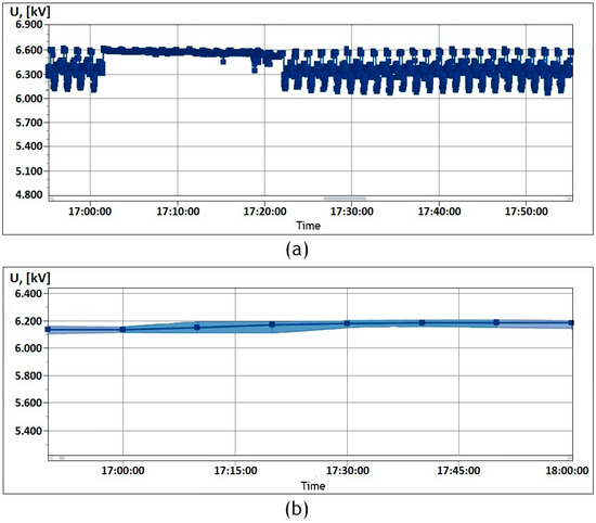 When conducting measurement using 1 s aggregation interval, the voltage level was captured more accurately compared to the use of 10 min aggregation interval. Figure 12 shows the variation in U12 voltage (blue dots) over a 12 h period and the voltage over-deviation threshold (red line that corresponds to +10% Unom). The dots above the red line are the voltage values exceeding the permissible level. The oscillogram demonstrates that the magnitude of voltage oscillations decreases significantly after 21:00. This reduction coincides with the end of the work shift at the enterprise, at which point the mine hoist ceases operation, thereby reducing its impact on the power system.