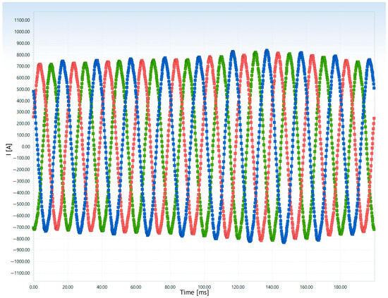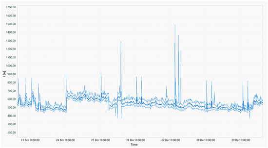 It should be noted that the current waveform (Figure 14) shows fluctuations from 150 A to 1050 A. The current change of almost 500 A within 1 s strongly affects electrical equipment deterioration.