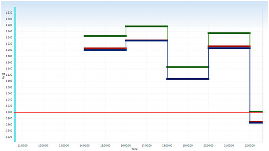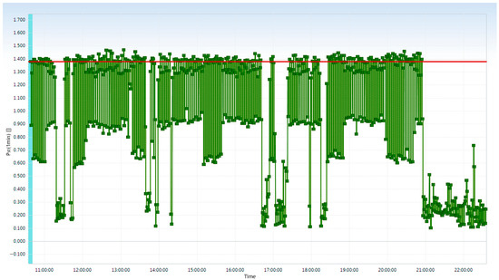 Figure 9 shows short-term flicker severity values (green dots) and its threshold (red line) that corresponds to 1.38 pu, while Figure 10 shows long-term flicker severity values and its threshold (red line) that corresponds to 1.00 pu. As can be seen, the values of both short-term and long-term flicker severity exceed the permissible limits.