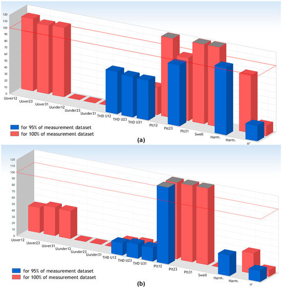 Figure 11 provides a direct comparison of PQI non-compliance with the GOST 32144-2013 [22] standard requirements when employing different data aggregation intervals. As can be seen from Figure 11a, the application of the 1s data aggregation method enables the revelation of eight PQIs exceeding the permissible level (red line), including phase-to-phase voltage over-deviations (Uover12, Uover23, Uover31), voltage swells, harmonic distortions, etc. It should be emphasized that when using the 10 min data aggregation method, some of these distortions are not captured in the summarized measurement report (Figure 11b).