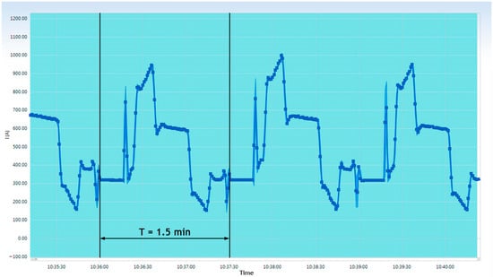 The current oscillograms depicted in Figure 13 and Figure 14 repeat the same pattern (mine hoist operation mode is cyclic) in terms of period and amplitude, but the waveforms are different, which can be explained by the influence of other low-power specific equipment of the mining facility.
