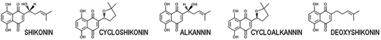 The natural chromogenic naphthoquinone [1] enantiomers shikonin and alkannin and their oligomers, metabolites, analogs, and derivatives (heretofore called “shikonoids”, a few of which are represented in Figure 1) are dark red to purple-colored lipophilic phytochemicals that are found primarily in the roots of plants of over 150 species in the Boraginaceae family, including the well-studied species Lithospermum erythrorhizon, Alkanna tinctoria, Arnebia euchroma, Batschia canensi, and Anchusa officinalis [2]. Shikonin, the R-enantiomer of 5,8-dihydroxy-2[(1R)-1-hydroxy-4-methylpent-3-en-1-yl]naphthalene-1,4-dione, and its derivatives are primarily associated with species found in plant species native to eastern Asia. In contrast, the S-enantiomer, alkannin, and its derivatives are primarily associated with European flora.