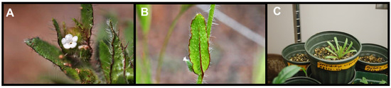 Plagiobothrys arizonicus. (A) Flowering P. arizonicus (southwestdesertflora.com, 10 June 2024). (B) P. arizonicus dorsal side of leaf with shikonoid-containing margins and mid-vein. (C) Lab-grown P. arizonicus source material.