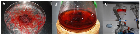 Plagiobothrys arizonicus root cultures with production of red colored shikonoids. (A) P. arizonicus roots on solid medium, and (B) in liquid medium/paraffin, all showing clear shikonoid production. (C) Partitioning of shikonoids from liquid paraffin (lower phase) with heptane (upper phase).