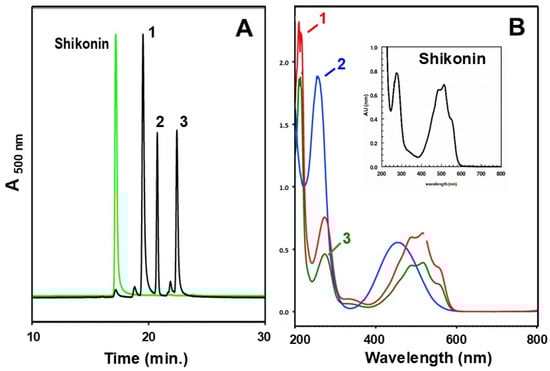 - Albreht, A.; Vovk, I.; Simonovska, B.; Srbinoska, M. Identification of shikonin and its ester derivatives from the roots of Echium italicum L. J. Chromatogr. A 2009, 1216, 3156–3162. [Google Scholar] [CrossRef]