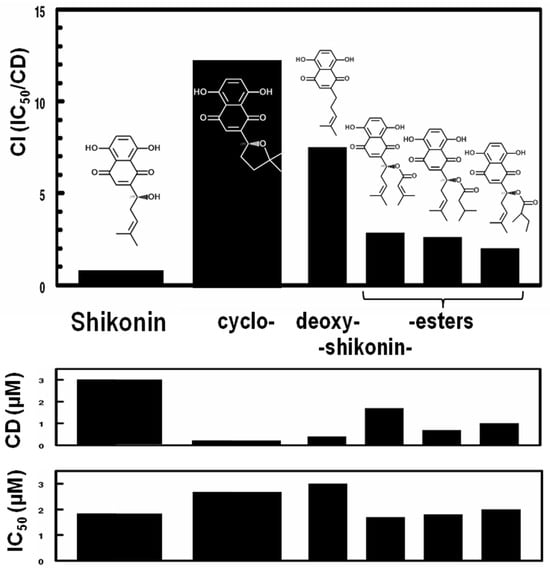 CI (Chemoprotective Index = IC50/CD), CD (Concentration to Double), and IC50 (Inhibitory Concentration to achieve 50% inhibition of growth) for NQO1 activity in Hepa 1c1c7 cell cultures treated with shikonoin, cycloshikonin, and three esters of shikonin: (left to right) β,β-dimethylacrylyl shikonin, isovaleryl shikonin, and 2-methylbutyryl shikonin.