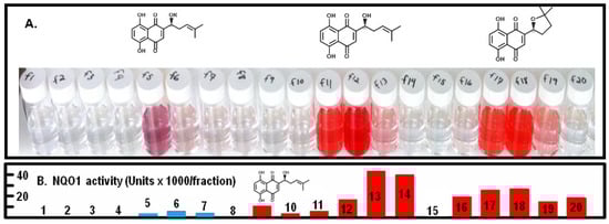 (A) Preparative CCC separation of a mixture of three shikonoids: fractions 5–6 (unknown), fractions 11–13 (shikonin), fractions 17–19 (cycloshikonin). (B) NQO1 inducer activity of sequential 15 mL fractions obtained from preparative CCC-fractionation of an Arnebia euchroma root extract. Red peaks are shikonoids (fractions 9 and 10 are shikonin/alkannin), and blue peaks are not shikonoids, since they do not show the very characteristic naphthazarin UV–visible absorption spectra.