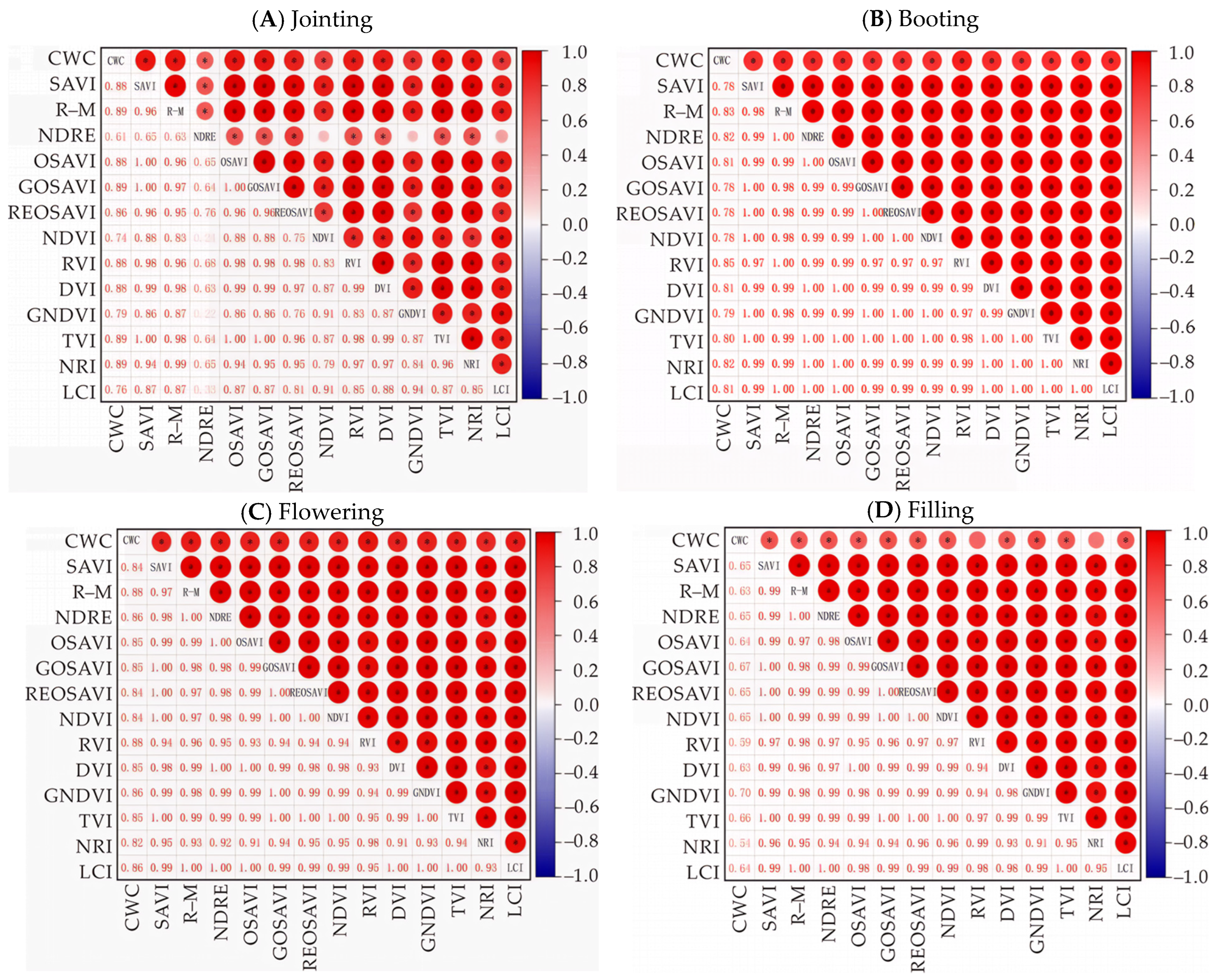 4.2. Vegetation Indices for Winter Wheat Water Status Retrieval