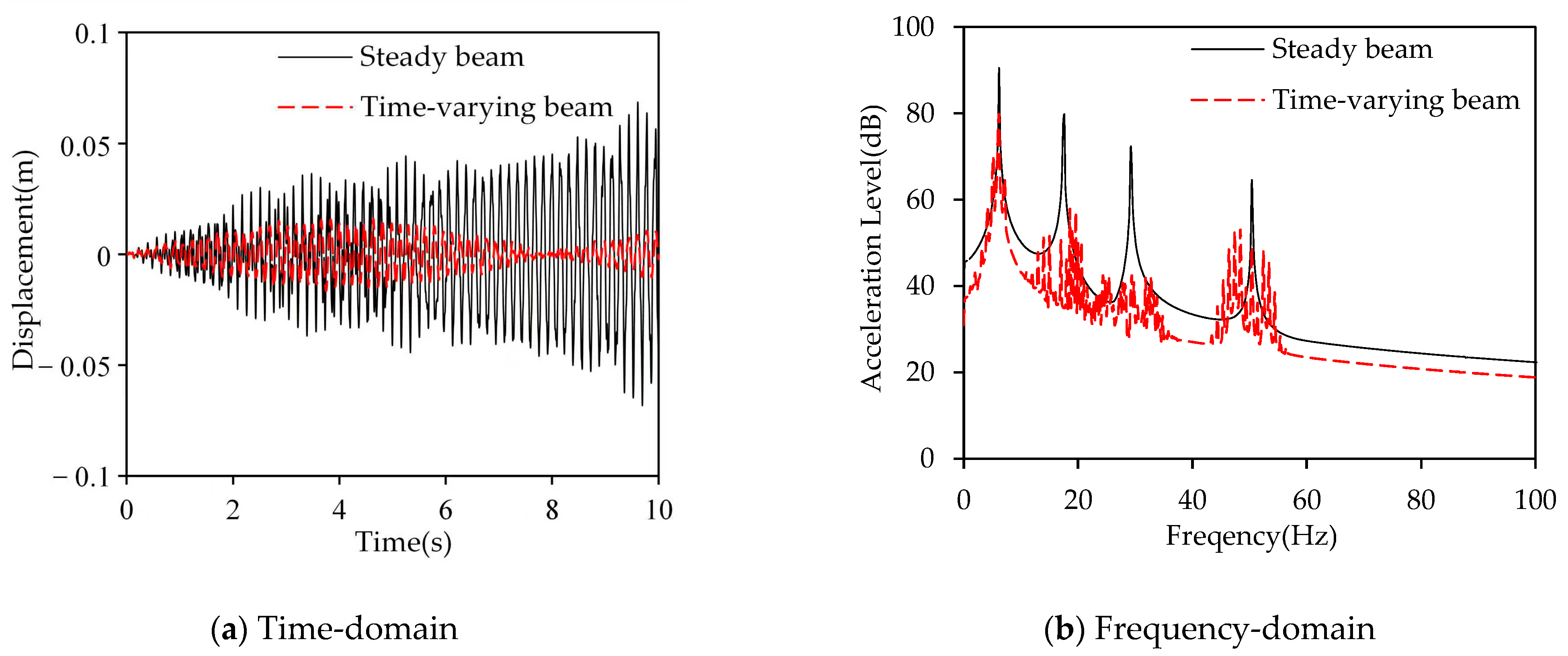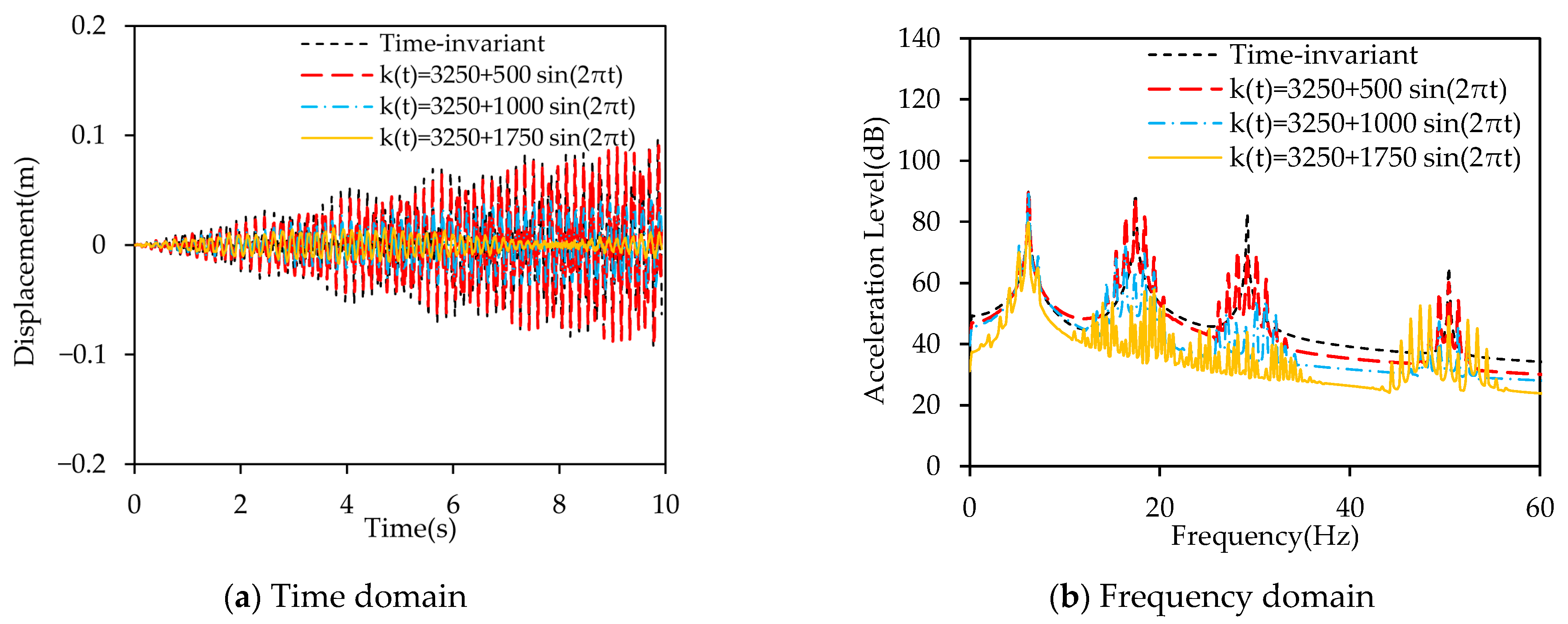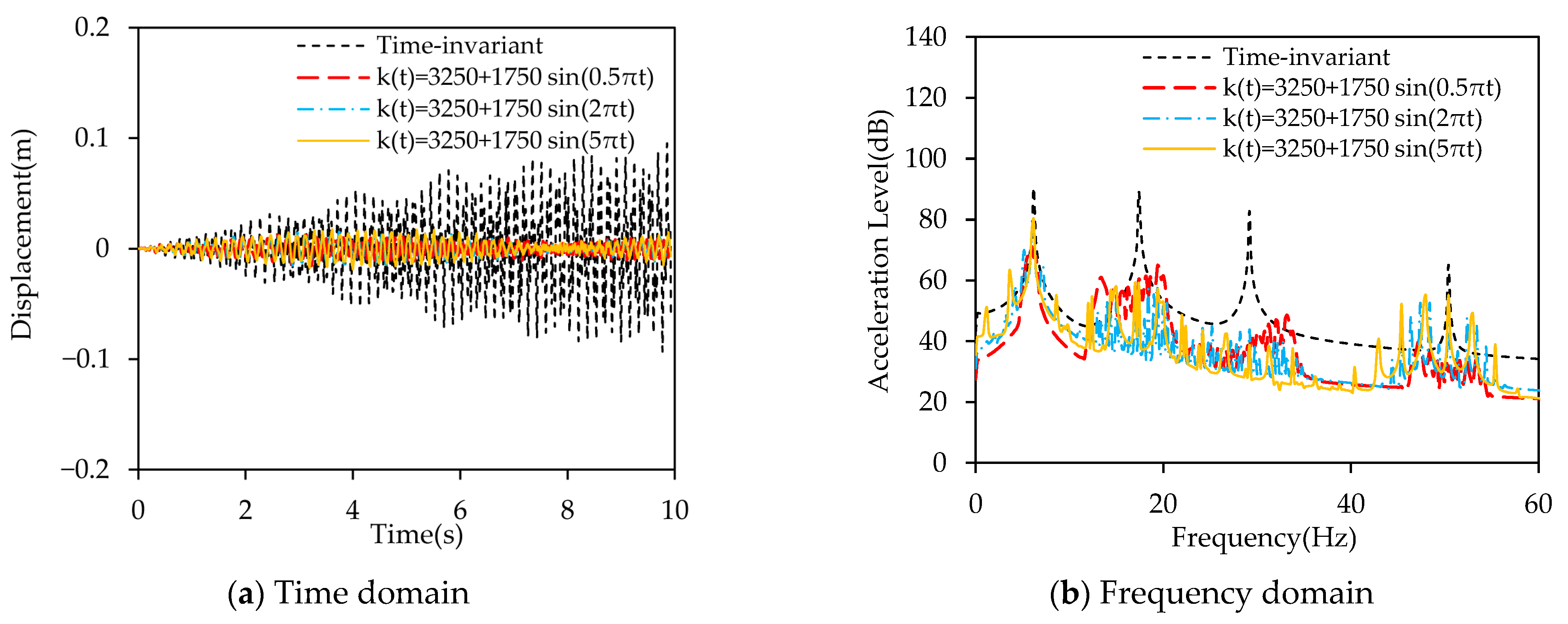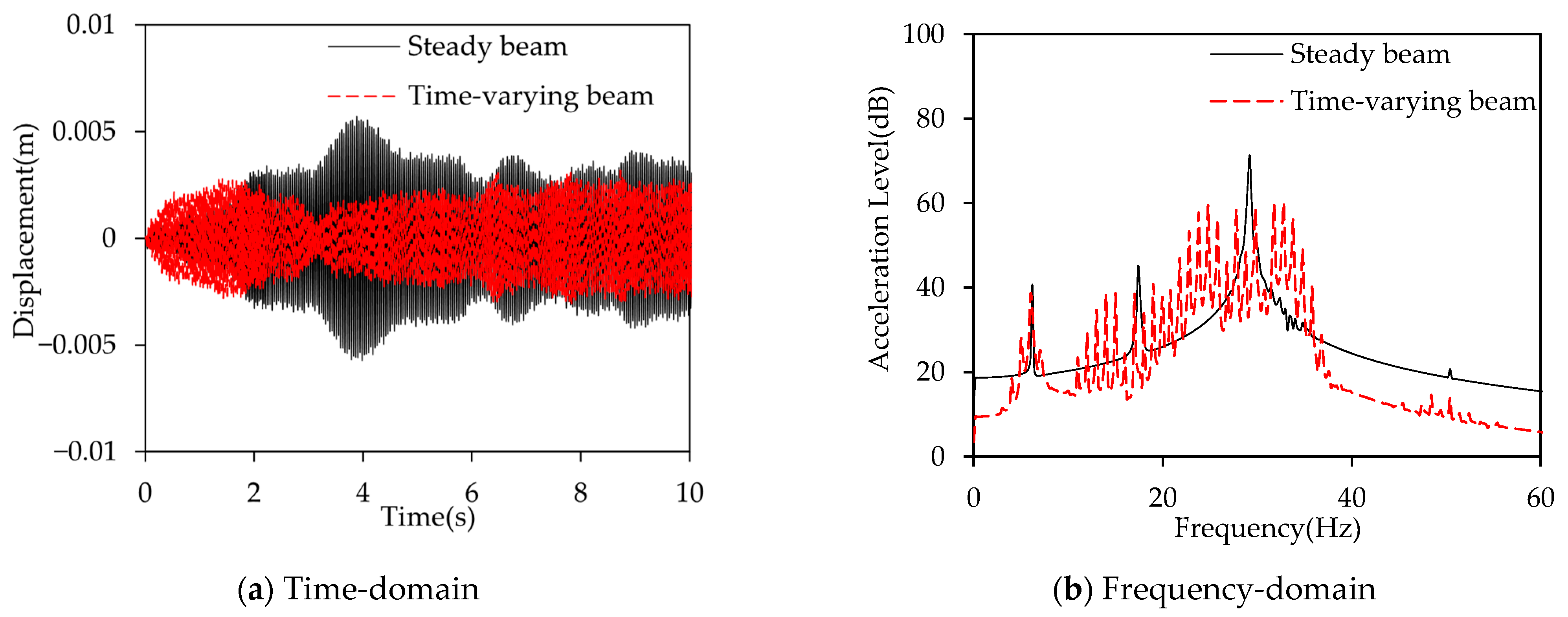 4.2. Resonance Suppression Performance of the Time-Varying Stiffness Beam