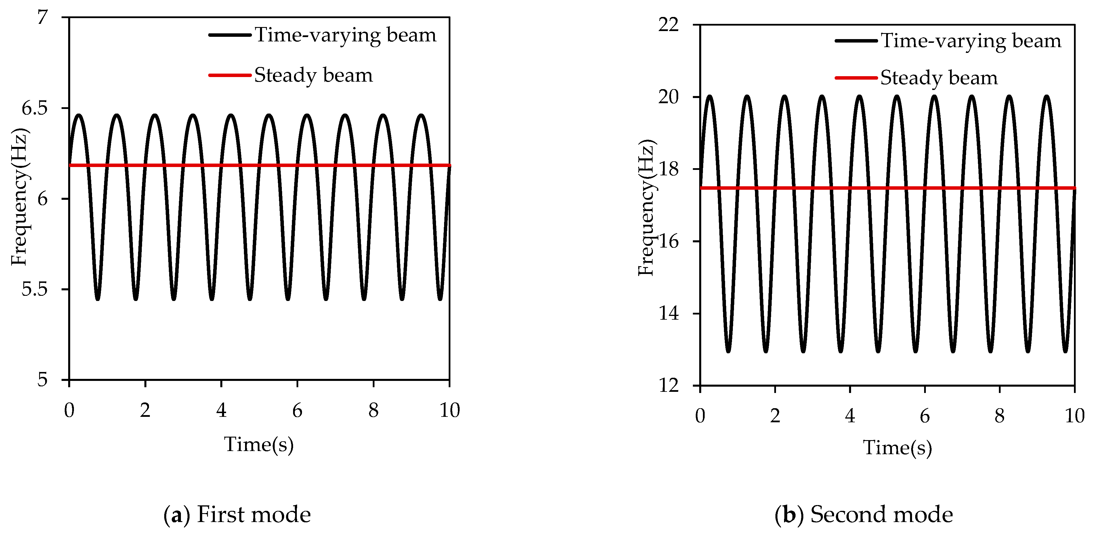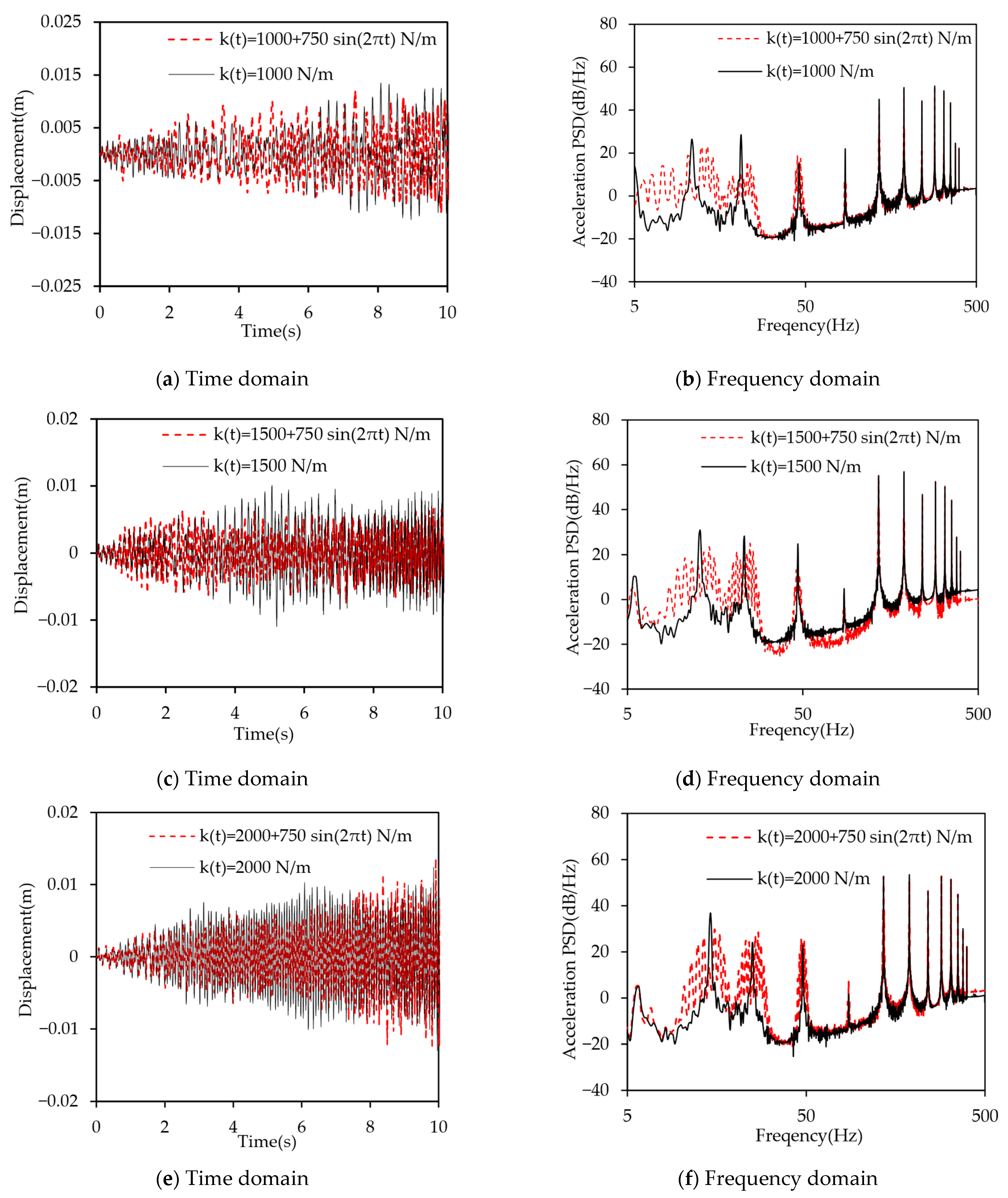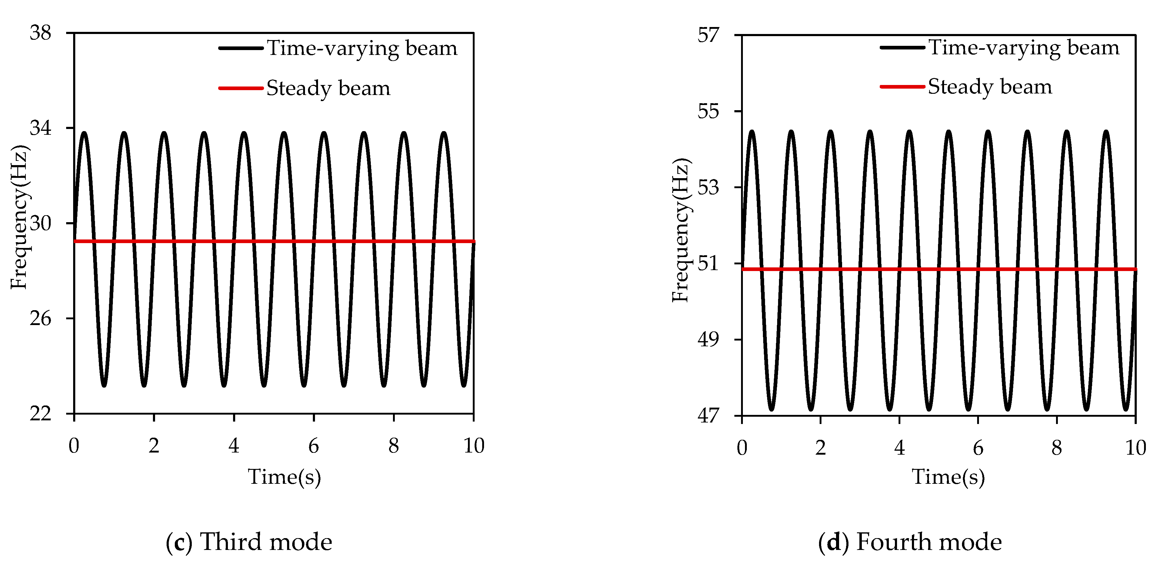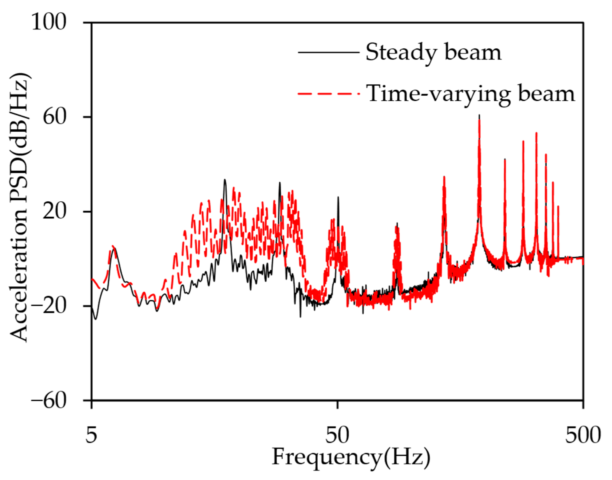 4.2. Resonance Suppression Performance of the Time-Varying Stiffness Beam