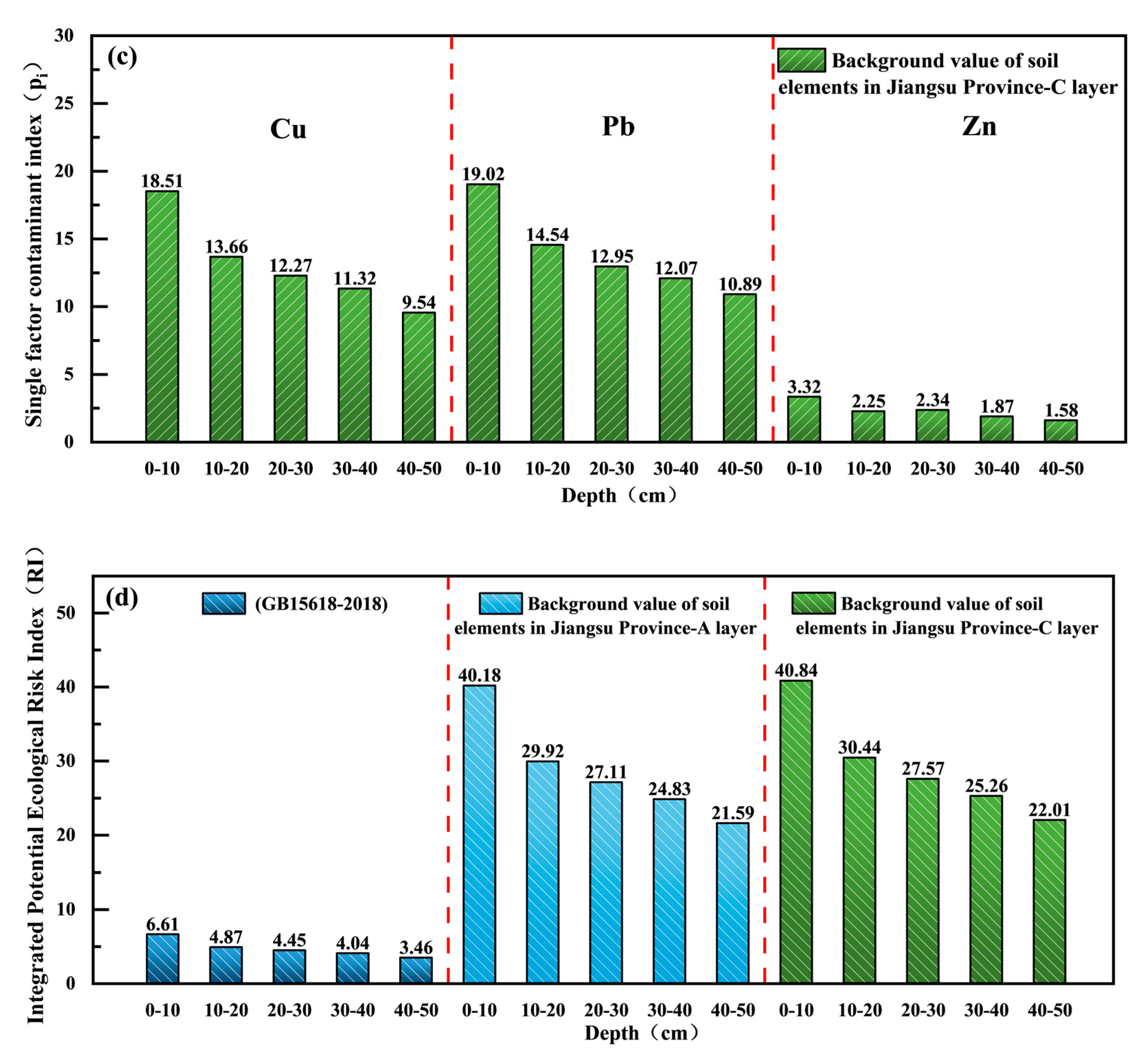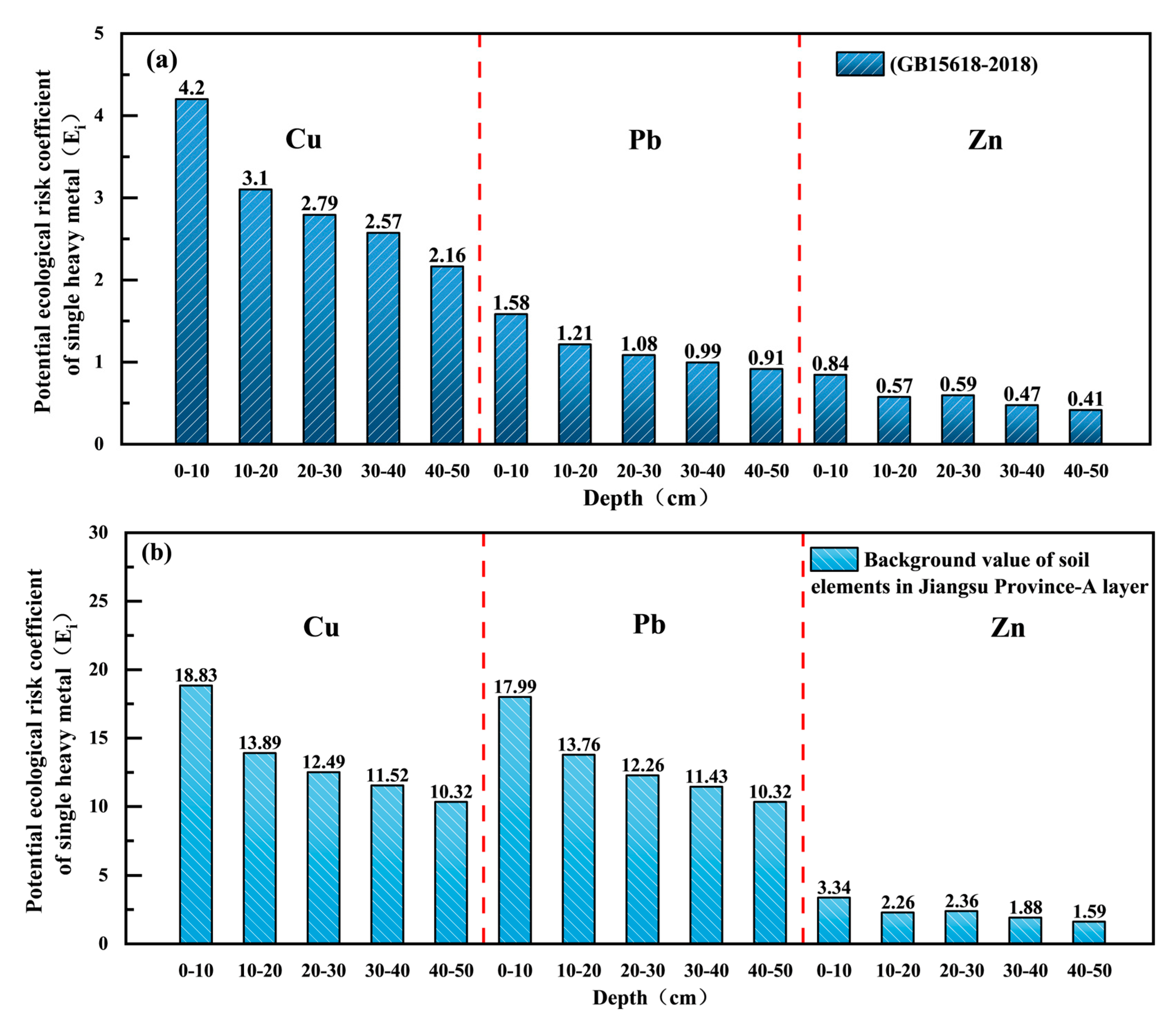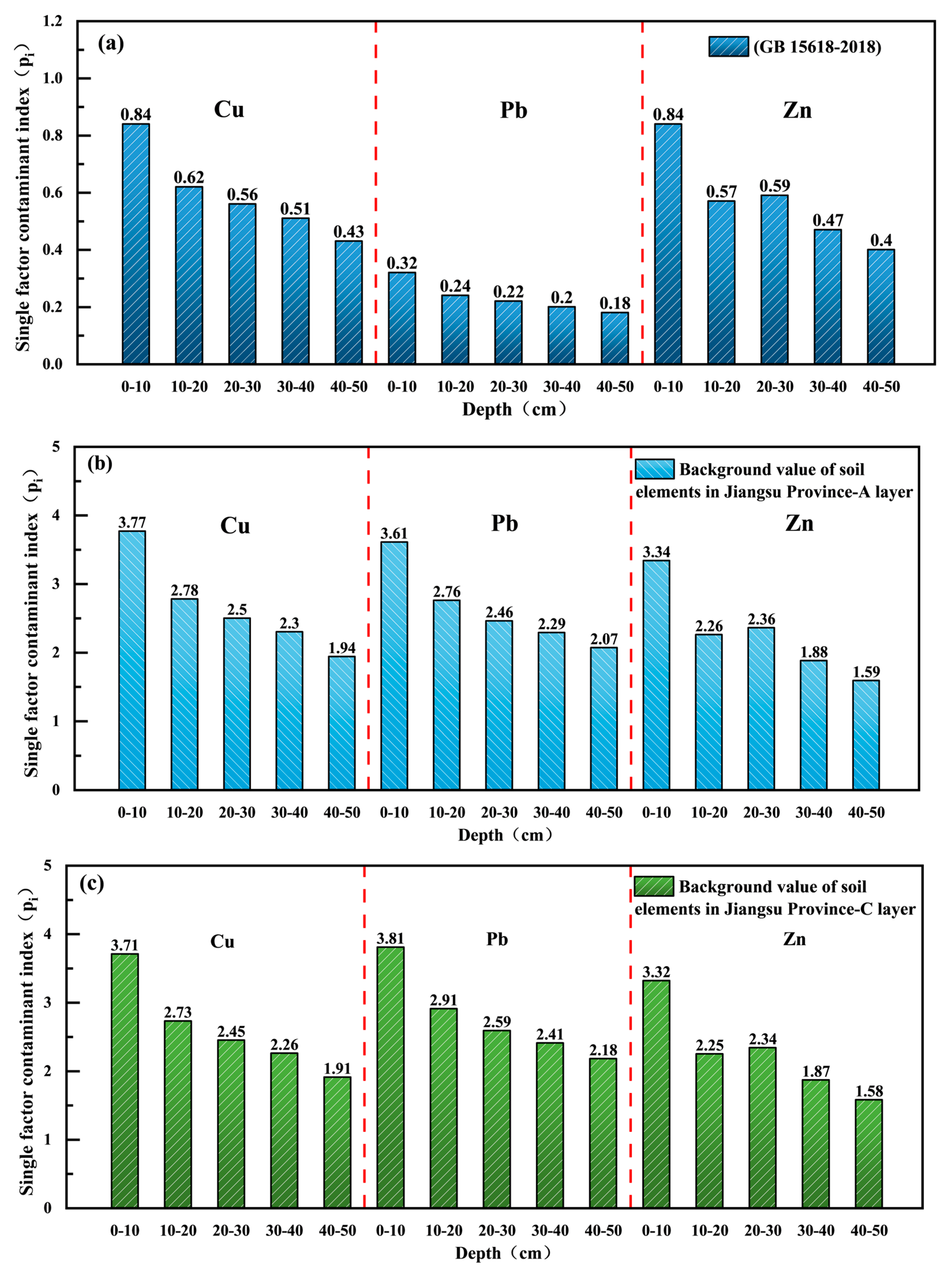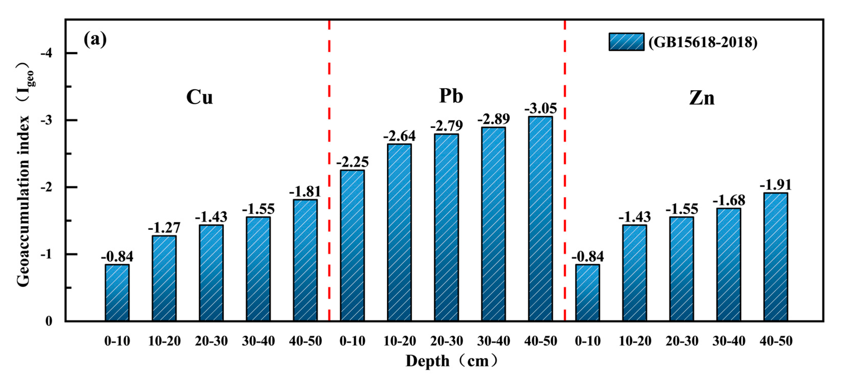 | Assessment Standards | Depth (cm) | Cu (mg/kg) | Pb (mg/kg) | Zn (mg/kg) |