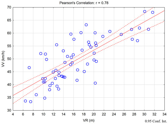 Correlations between vortex release velocity (VV) and vortex throwing results (VR).