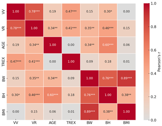 Correlation heatmap of age, training experience and anthropometric indices with throwing performance. Note: * correlations are significant at p < 0.05; ** correlations are significant at p < 0.01; *** correlations are significant at p < 0.001; VR—vortex throwing distance/result; VV—vortex release velocity; TREX—training experience; BW—body weight; BH—body height; BMI—body mass index.