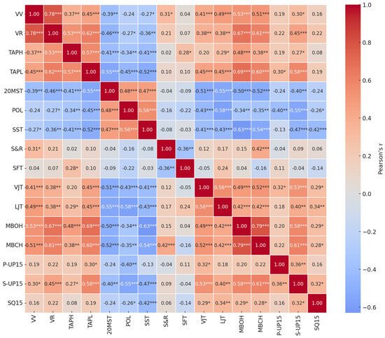 Correlations between motor abilities and throwing performance. Note: * correlations are significant at p < 0.05; ** correlations are significant at p < 0.01; *** correlations are significant at p < 0.001; VR—vortex throwing distance/result; VV—vortex release velocity; TAPH—hand tapping test, TAPL—leg tapping test, 20MST—the 20 m sprint with a standing start, POL—the polygon backwards test, SST—side step test, S&R—sit and reach flexibility test, SFT—shoulder standing flexibility test with stick, VJT—standing vertical jump test, LJT—standing long jump test, MBOH—standing overhead medicine ball throw/1 kg, MBCH—standing chest medicine ball launch/1 kg, P-UP15—push-ups test, S-UP15—sit-ups test; SQ15—squats test.