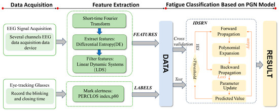 In this study, we employ the IDSRN to model and classify electroencephalogram (EEG) signals for effective driver fatigue-state recognition. As shown in Figure 3, preprocessed EEG signals are first fed into the IDSRN model. By incorporating recursive mechanisms and polynomial expansion layers, the model can effectively capture nonlinear dynamic characteristics in EEG signals while utilizing historical time-series information to enhance its modeling capability for fatigue-state evolution. Specifically, the input to the IDSRN consists of multi-scale features extracted through discrete wavelet transform (DWT), including energy, variance, and power spectral density from each sub-band. These features not only reflect the frequency characteristics of brain activity but also contain dynamic information about fatigue-state progression over time.