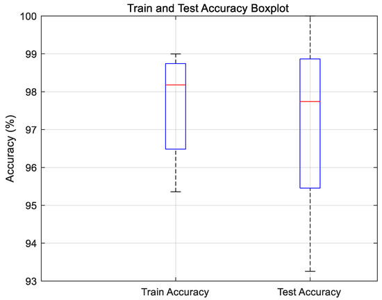 The experimental results demonstrate that when the highest order was set to 2, the average training and testing accuracies were the highest, reaching 97.87% and 96.25%, respectively. The average runtime per experiment was 21.80 s. Figure 5 below shows the boxplot of the training and testing accuracies of the IDSRN model in the 10-fold cross-validation experiment.