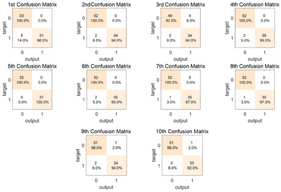 Furthermore, the 10 confusion matrices are shown in Figure 6. The final experimental results show an average accuracy of 97.06%, a sensitivity of 98.80%, and a specificity of 94.40%. These results demonstrate that the proposed IDSRN classification model achieves high accuracy in fatigue classification.