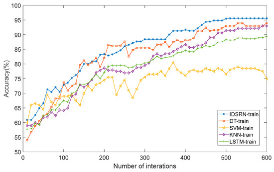 As shown in Figure 8, in terms of convergence speed, an analysis of multiple sets of experimental data clearly indicates that the IDSRN method can reach a stable state in a relatively short time. In contrast, DT, SVM, and KNN methods show a certain lag in the convergence process and require more iterations to gradually stabilize. Although LSTM has certain advantages among deep learning methods, its convergence speed is still slightly inferior compared to the IDSRN method. This is mainly due to three reasons: (1) the IDSRN uses polynomial approximation for nonlinear functions, providing a clear mathematical expression and calculation method, facilitating parameter adjustment; (2) integrating ResNet ideas accelerates information transmission and parameter updates; and (3) we introduced the Adam algorithm to improve convergence speed.