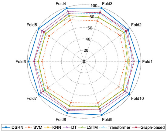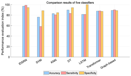 In this experiment, the proposed IDSRN classifier is compared with multiple baseline methods, all of which were implemented using the same EEG and eye-tracking data from the SEED-VIG dataset. For SVM, we used a radial basis function (RBF) kernel with hyperparameters optimized via grid search (C = 1.0, gamma = 0.1). The KNN classifier used Euclidean distance metric with k = 5 neighbors. Decision Tree (DT) was configured with Gini impurity as the splitting criterion and a maximum depth of 10. LSTM architecture consisted of two recurrent layers with 64 hidden units each, using tanh activation. The Transformer model implemented a six-layer encoder with eight attention heads and a feed-forward dimension of 256. Graph-based classification employed a GCN architecture with two convolutional layers, where the adjacency matrix was constructed based on electrode spatial relationships. All models were trained using the same training–validation split and optimized for 250 epochs with early stopping. A 10-fold cross-validation was performed, with 10% of the data selected as the test set. The classification results for the SVM, KNN, DT, LSTM, Transformer [28], and graph-based [29] classification algorithms are shown in Figure 9 and Table 2: