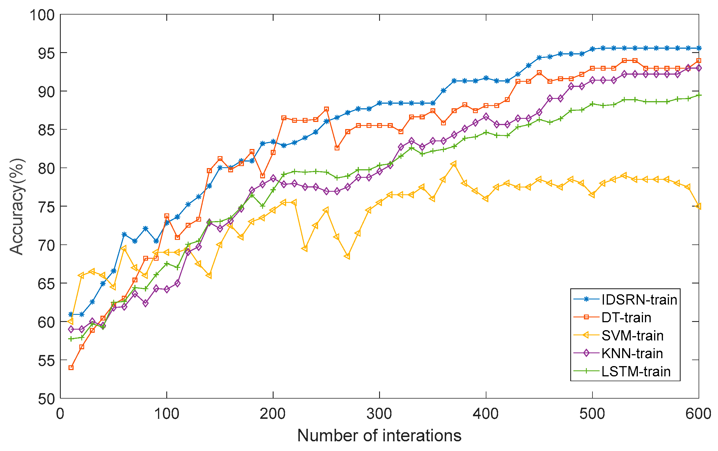 Figure 8, in terms of convergence speed, an analysis of multiple sets of experimental data clearly indicates that the IDSRN method can reach a stable state in a relatively short time. In contrast, DT, SVM, and KNN methods show a certain lag in the convergence process and require more iterations to gradually stabilize. Although LSTM has certain advantages among deep learning methods, its convergence speed is still slightly inferior compared to the IDSRN method. This is mainly due to three reasons: (1) the IDSRN uses polynomial approximation for nonlinear functions, providing a clear mathematical expression and calculation method, facilitating parameter adjustment; (2) integrating ResNet ideas accelerates information transmission and parameter updates; and (3) we introduced the Adam algorithm to improve convergence speed.