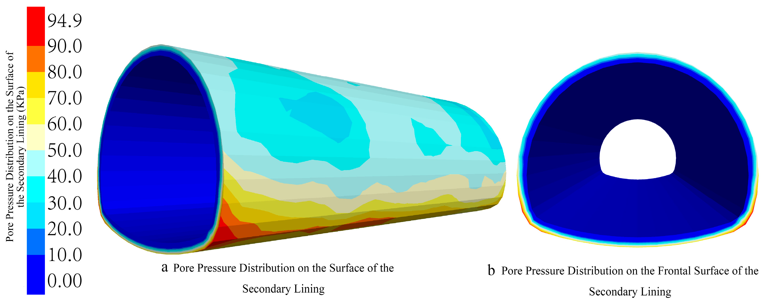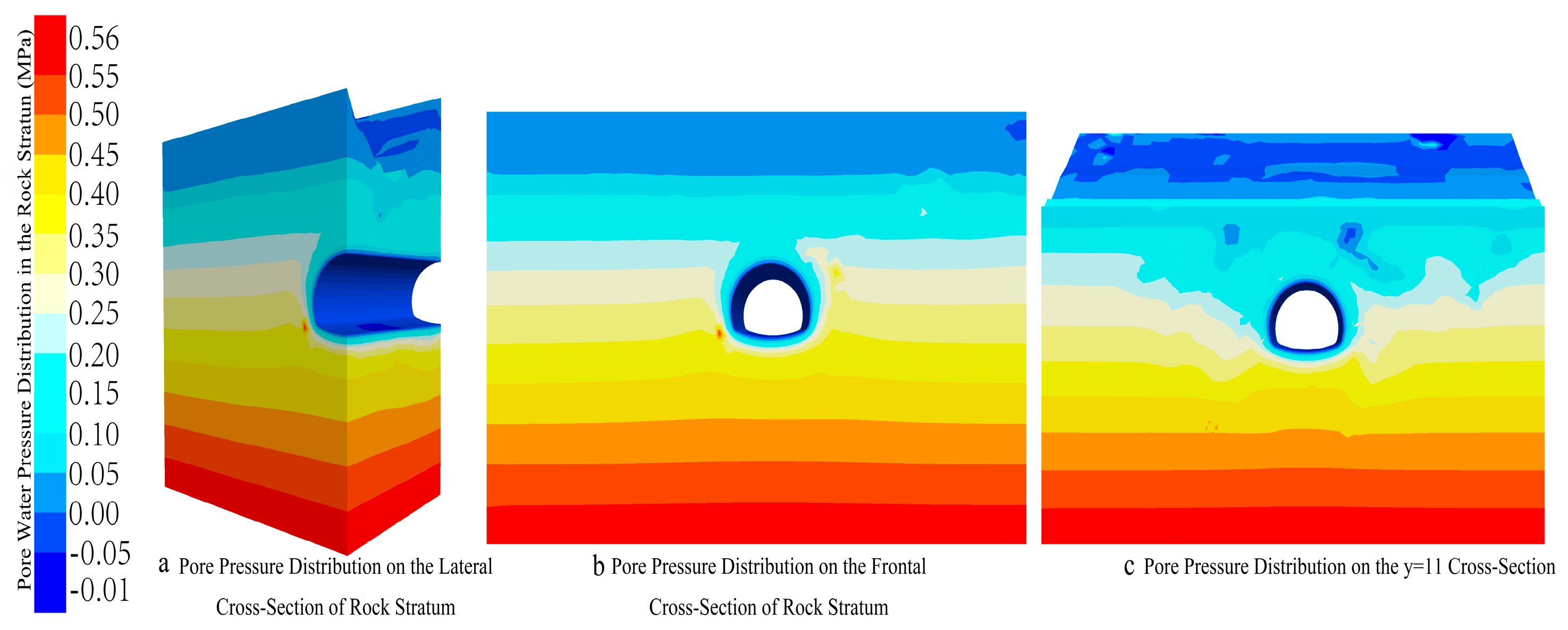 - It clarifies the “seepage-control and convergence” effect of gully topography and the redistribution law of pore water pressure under heavy rainfall infiltration. Numerical simulations reveal that rainfall converges at the gully bottom under the control of the gully’s “concave” topography, causing the pore water pressure of the rock stratum to increase from the top to the bottom, with the maximum reaching 0.55 MPa at the bottom. For the first time, it systematically presents a binary distribution pattern of “uniform below, disordered above” bounded by the tunnel, especially forming a significant pore water pressure extension zone directly below the aqueduct. This law clarifies that the reconstruction of the seepage field is the primary external environmental factor affecting tunnel stability.