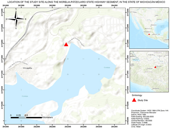 This study site is a rock slope located along State Highway No. 171, between Morelia and Pátzcuaro, in Michoacán, Mexico. It consists of an exposed road cut, approximately 100 m in length and reaching a maximum height of 14 m at its highest point. Just a few meters away lies the Cointzio Dam, an important water supply source for the city of Morelia and its surrounding areas. Figure 1 and Figure 2 show the geographical location of the study site and its position relative to the highway.