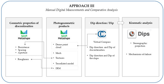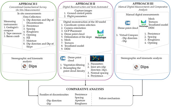 The methodology implemented in this study integrates traditional field measurements with digital measurement techniques and semi-automated processes applied to three-dimensional photogrammetric models, with the aim of analyzing discontinuities in rock slopes. This methodology is structured into three main approaches, as shown in Figure 3.