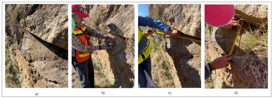 Field recording during the conventional geomechanical survey. (a) Marking of discontinuity plane with white chalk; (b) measurement of dip and dip direction with a geological compass; (c) measurements of persistence using a measuring tape; (d) measurement of discontinuity aperture.