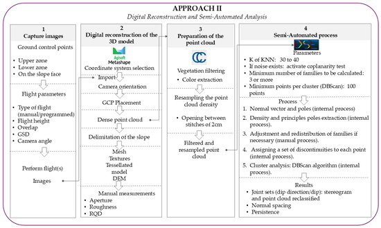 The second approach of the methodology consisted of generating a three-dimensional model of the slope using digital photogrammetry techniques, followed by a semi-automated analysis based on point cloud data (Figure 5).