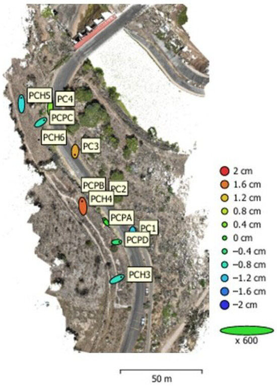 Figure 6. Spatial Distribution of GCP Reprojection Error. Each Ground Control Point (GCP)’s location and associated reprojection error are expressed in centimeters. Most GCPs show values below ±2 cm, indicating high geometric accuracy in the photogrammetric model.