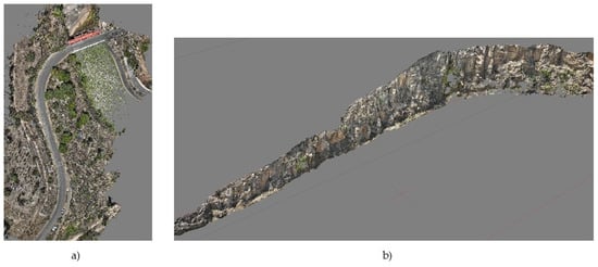 Figure 7 presents two comparative views of the generated 3D model: Figure 7a shows the full model, which includes the immediate surroundings of the slope, while Figure 7b displays the delimited point cloud, focused exclusively on the rocky slope face for detailed geomechanical analysis.