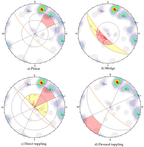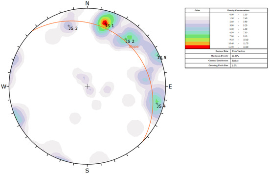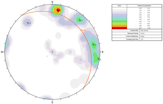 Additionally, the general orientation of the slope and its inclination angle were measured to assess the potential failure mechanism. The data collected in the field were subsequently analyzed using stereographic projections through the Dips software version 8.011. This tool allows the representation of discontinuity planes on a Schmidt projection, facilitating the identification of dominant sets through statistical analyses based on the Fisher distribution. Dips also enable preliminary kinematic analysis by considering the most common failure modes in rock masses, such as planar sliding, wedge failures, and toppling. This analysis is based on the comparison between the orientations of the discontinuities and the geometry of the slope, allowing the evaluation of the kinematic compatibility of potential failure mechanisms.