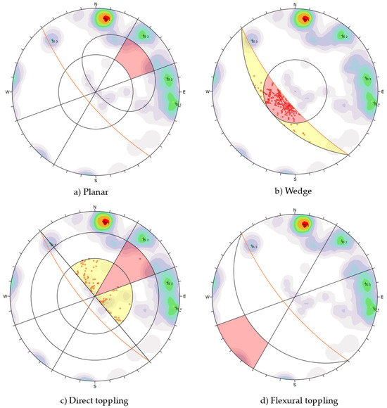 In contrast, the semi-automatic method enables a comprehensive analysis of the entire slope, covering all groupings detected during the segmentation process. In this case, the dip direction and dip angle of each family are explicitly defined within the model, allowing for the objective selection of the most unfavorable family based on the SMR correction factors. Unlike the other methods—where the stereogram does not indicate which family each plotted point belongs to—the semi-automatic approach offers a direct correspondence, reducing subjectivity and facilitating the selection of critical conditions for analysis.