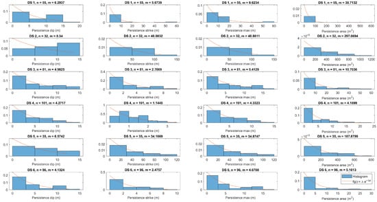 Regarding persistence, the conventional method showed an average of 2.07 m, the manual digital method 1.96 m, and the semi-automatic method a median of 5.63 m in the dip direction. While this last value may seem high, it is justified by the algorithm’s nature, which groups continuous segments based on spatial density. The median was chosen as a representative measure due to the skewed distribution of the data, improving comparability with the other methods and supporting the validity of the semi-automatic approach.