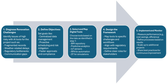 Building on these empirical findings and the literature review, we identified specific applications where digital tools could address the observed challenges. For instance, ML algorithms could analyze extensive datasets of building characteristics, similar to the fragmented records identified in our interviews. When combined with cost–benefit analysis models, these digital tools could support strategic planning of building renovations [24,41].