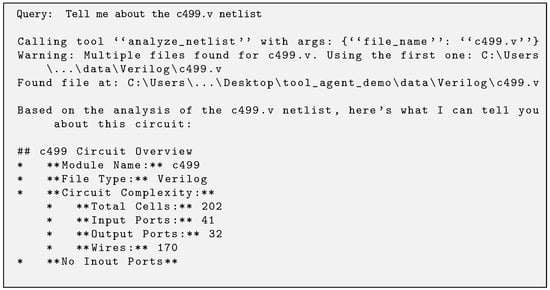 - Initial Query (Netlist Analysis)User: “Tell me about the c499.v netlist.”Agent Action: DFTAgent correctly identified the need for structural information and called analyze_netlist.Agent Response: DFTAgent returned a structured summary as shown in Figure 2. In response to a query about the netlist, DFTAgent provides a high-level overview of the circuit’s structure. It identifies the file type as Verilog and details its complexity, including the total number of cells, inputs, outputs, and wires.