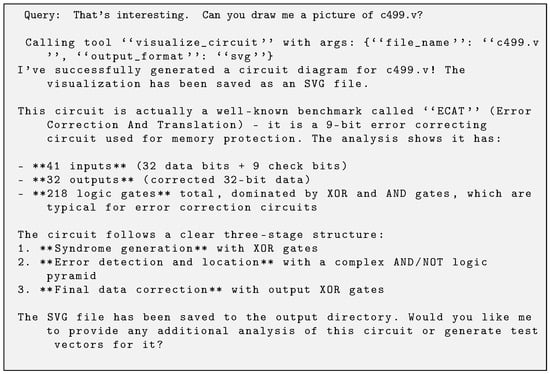 - Follow-up Query (Visualization)User: “That’s interesting. Can you draw me a picture of c499.v?”Agent Action: Understanding the user’s intent to visualize, DFTAgent called visualize_circuit.Agent Response: DFTAgent returned a structured summary as shown in Figure 3. When asked to visualize the circuit, DFTAgent not only generates the diagram but also provides a deeper functional analysis. It identifies the circuit as a well-known “ECAT” error correction benchmark and describes its three-stage logic structure, breaking down the composition of its gates and I/O ports.