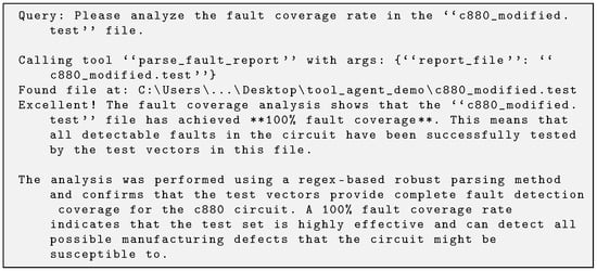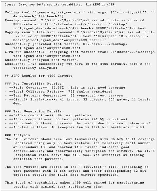 - Final Query (ATPG Execution)User: “Okay, now let’s see its testability. Run ATPG on c499.” (Note: DFTAgent must infer the correct file format,.bench).Agent Action: The agent correctly inferred the corresponding .bench file and called generate_test_vectors.Agent Response: DFTAgent returned a structured summary as shown in Figure 4. For the ATPG task, DFTAgent executes the workflow and presents a comprehensive testability report. It highlights key metrics, such as achieving 96.57% fault coverage with 55 compacted test patterns, and offers a detailed analysis of the fault types and the effectiveness of the test pattern compaction.