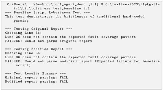 - Finding 3: DFTAgent exhibits superior robustness and adaptability compared to traditional hard-coded scripts. In a direct baseline comparison, a standard Tcl script failed when faced with a minor alteration to a report file format. In contrast, DFTAgent successfully parsed the modified report, demonstrating its ability to handle unexpected variations in tool output. This resilience to superficial formatting changes directly addresses a core weakness of script-based automation, reducing maintenance overhead and proving the framework’s potential to create more robust and adaptive EDA workflows.