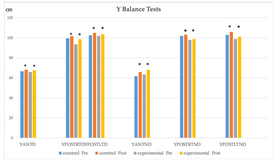Y-POSTRTND: There were statistically significant differences in the variable Y-POSTRTND in the time factor (effect of intervention) (F1,20 = 2.634, p-value < 0.05). However, the interaction (time × group) was not statistically significant (p-value > 0.05).