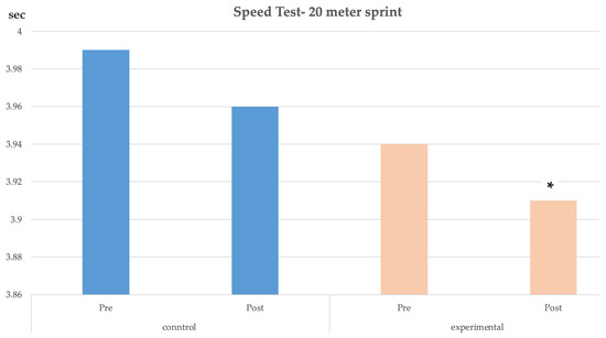 Figure 4): Statistically significant differences were found in the 20 m sprint test results in the time factor (intervention effect), (F1,20 = 23.365,