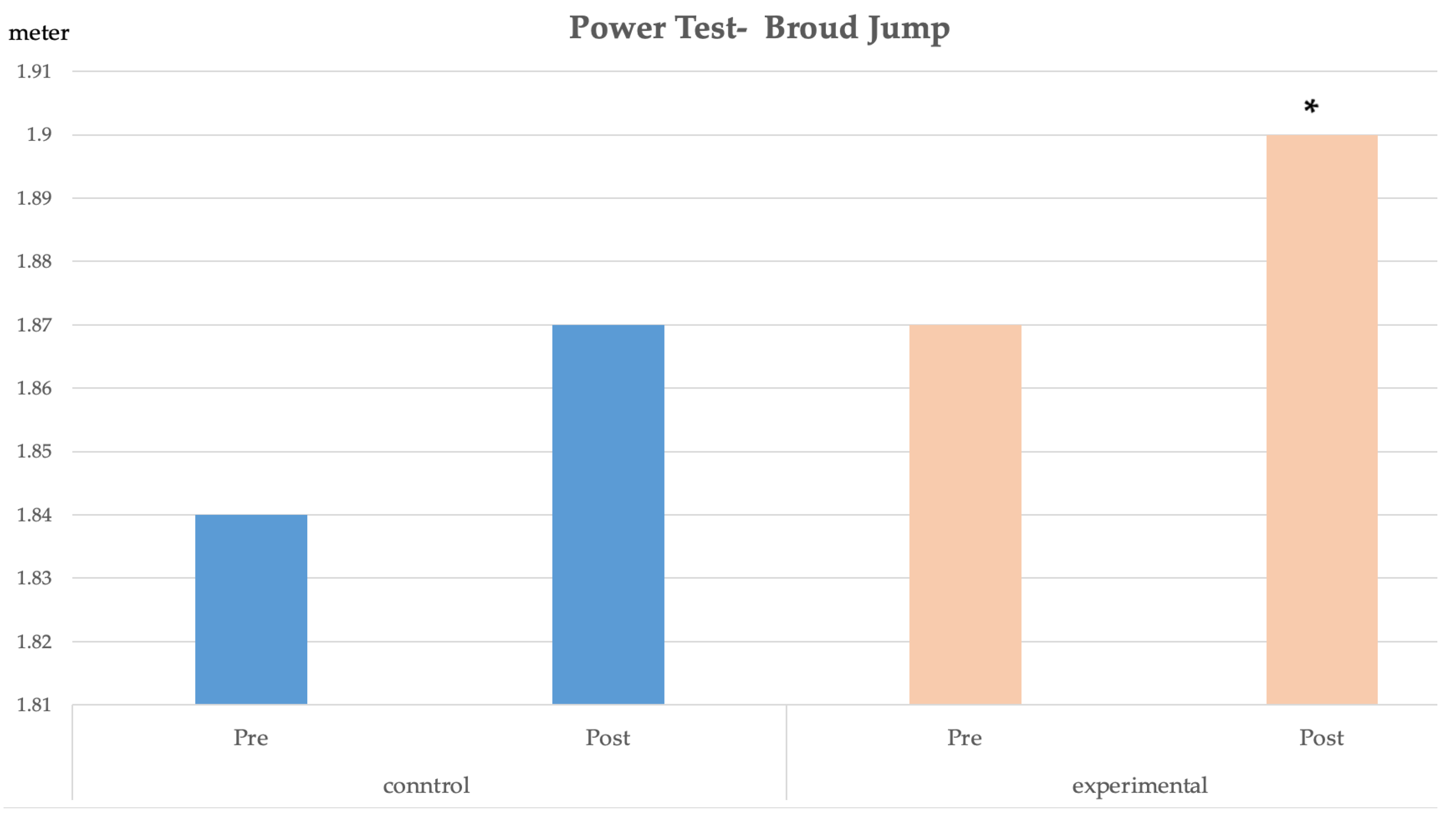Figure 5): Statistically significant differences were found in the jump to distance test in the time factor (intervention effect) (F1,20 = 131.515,