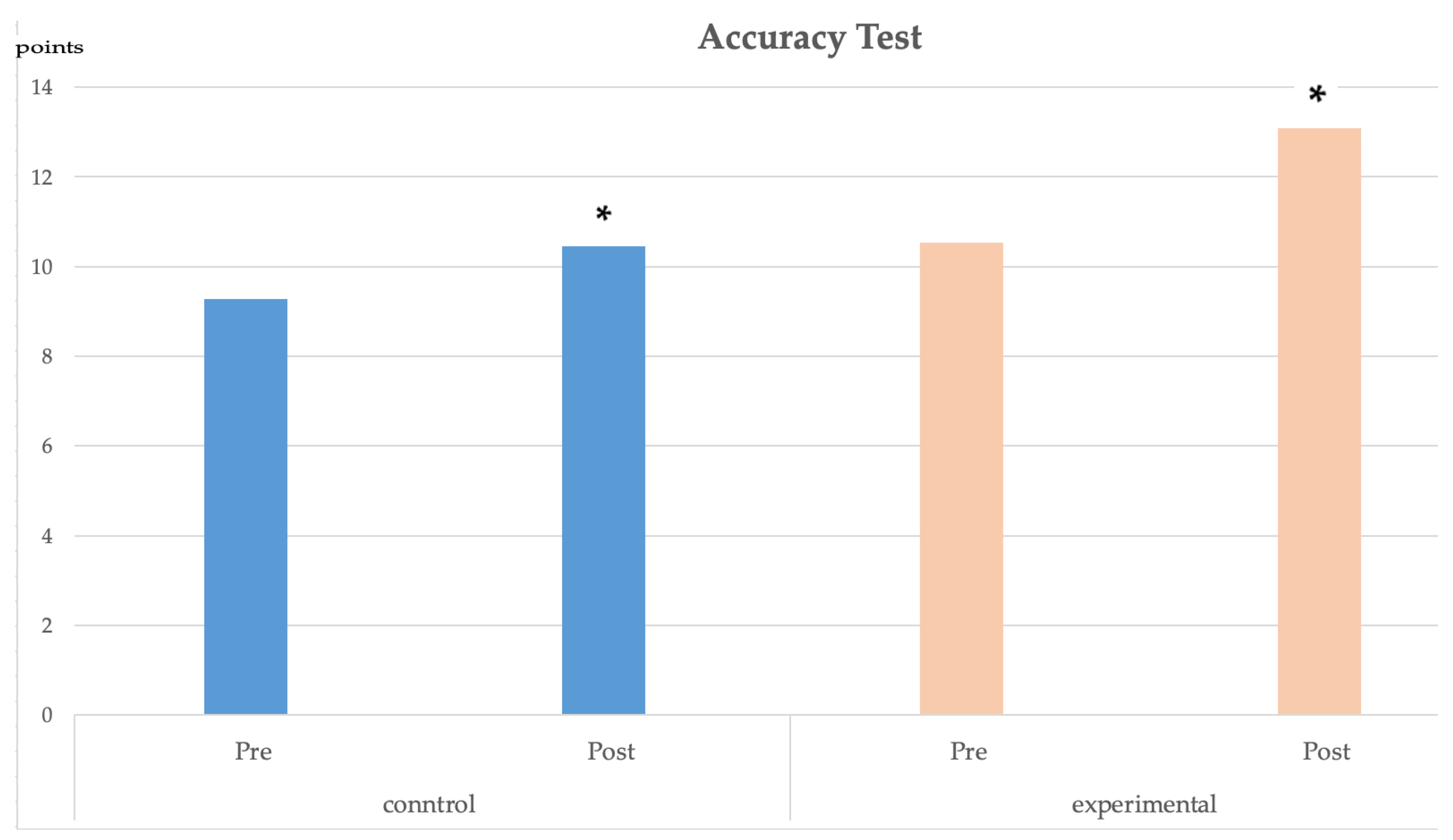 Figure 6): Statistically significant differences were found in the shooting accuracy variable in the time factor (effect of intervention) (F1,20 = 7.627,