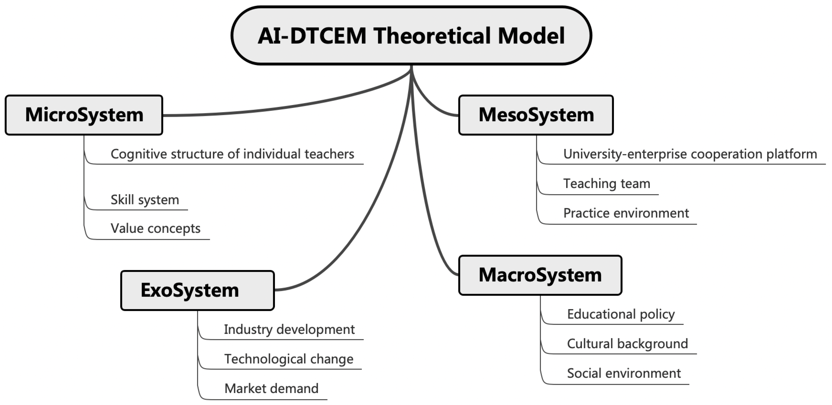 12]. (2) Innovation from single-dimension to multi-dimensional synergy. Traditional models often focus on developing a single dimension, such as teaching skills or professional knowledge. In contrast, AI-DTCEM creates a three-dimensional synergy mechanism involving knowledge, capacity, and environment, allowing for cross-dimensional capacity transfer and integration. This multi-dimensional synergy mechanism expands upon the core ideas of Bronfenbrenner’s ecological systems theory within the context of AI-empowered technology, resulting in a unique three-dimensional synergy framework [