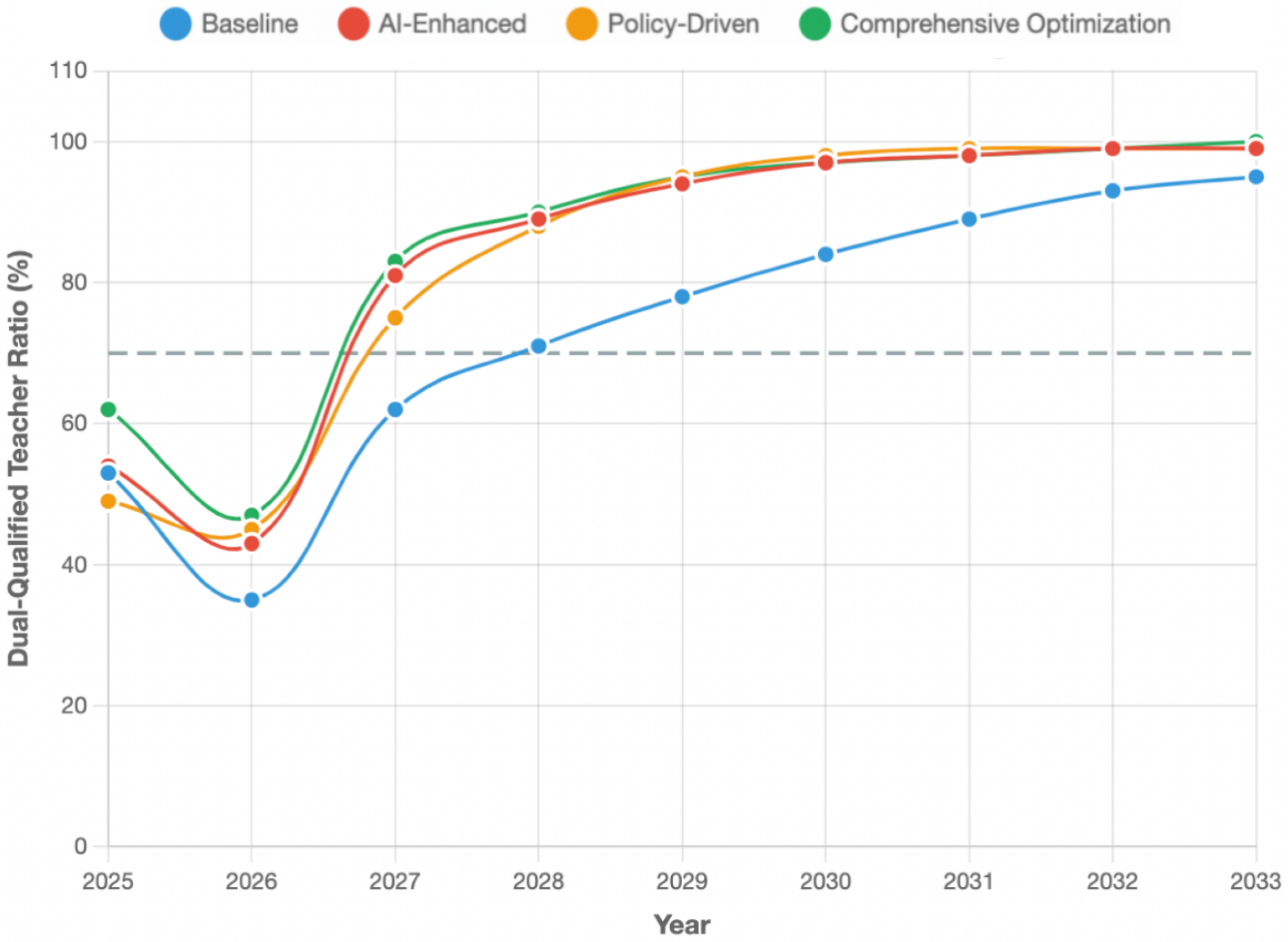 Beginning in the year 2025, an 8-year simulation experiment illustrates significant differences in the increase in dual-qualified teachers, as shown in