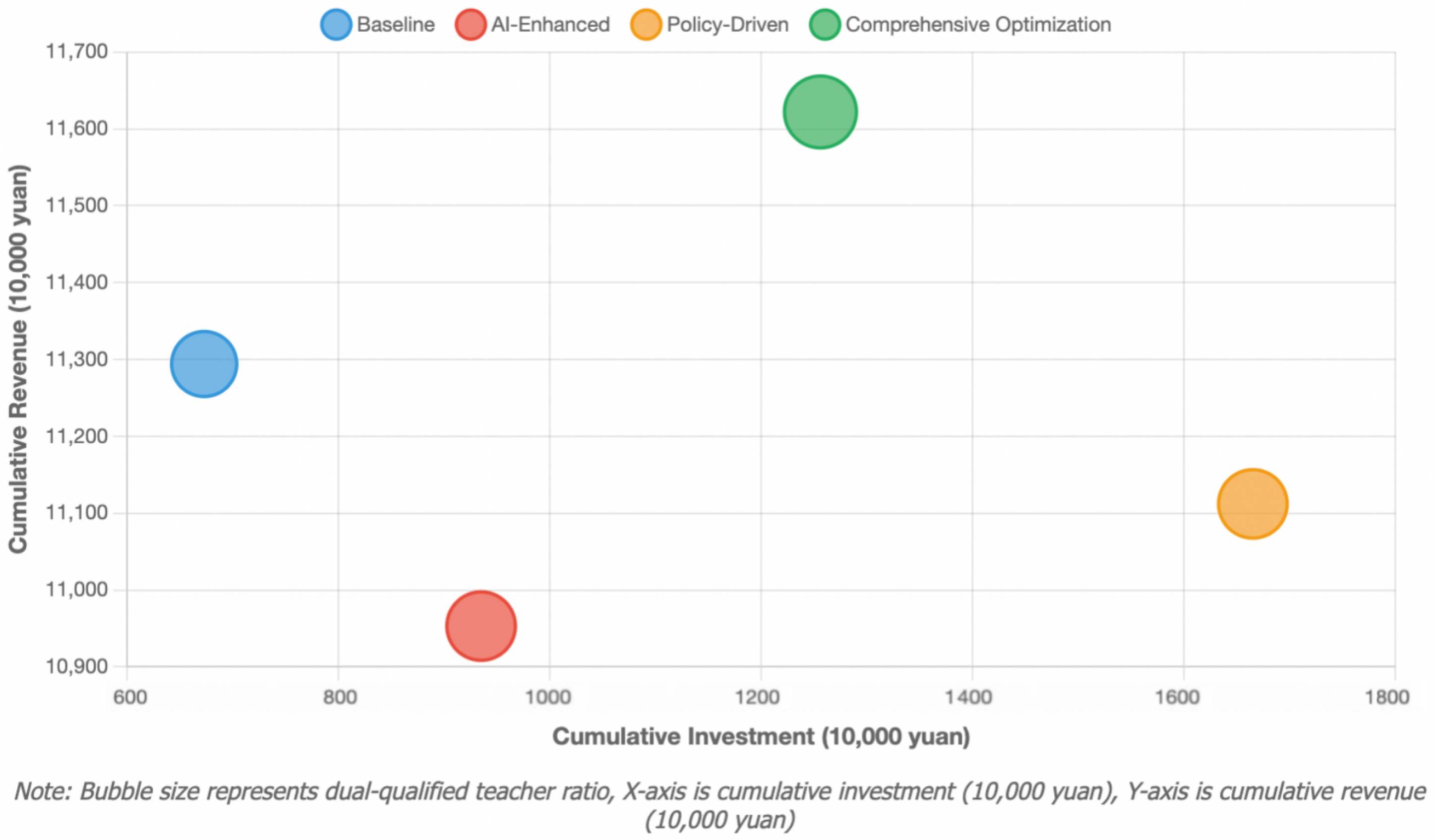 Figure 9 presents the cost-effectiveness relationship of each scenario in a scatter plot. The size of each bubble represents the proportion of dual-qualified teachers, with the x-axis showing cumulative investment and the y-axis indicating cumulative return.