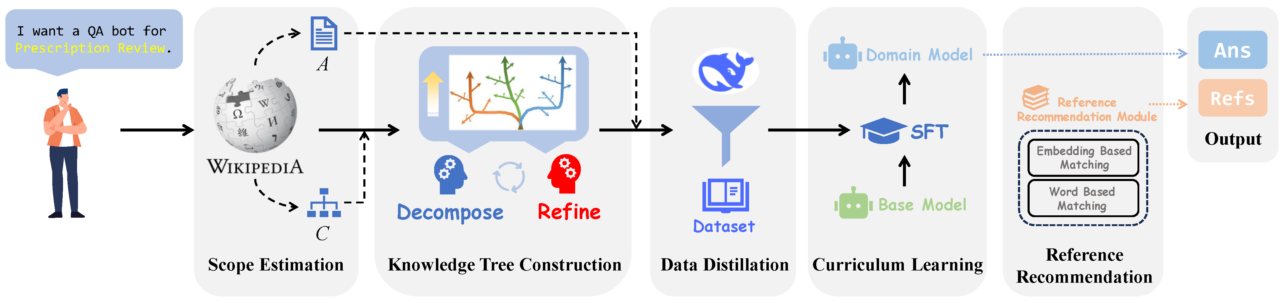 Figure 1, this process faces several challenges, including the scarcity of high-quality domain data and the often ill-defined structure of domain knowledge. Manual data collection is prohibitively costly in terms of both time and human effort. Consequently, distilling knowledge from cutting-edge LLMs has become a widely adopted and scalable alternative [