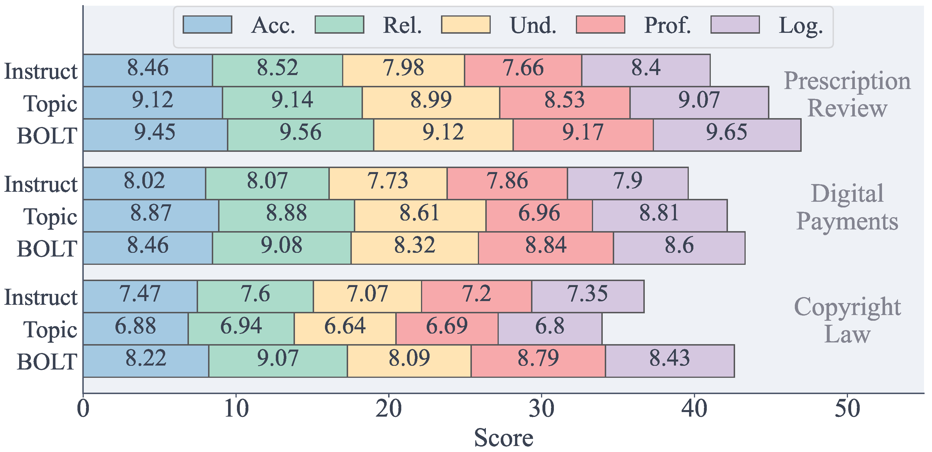 1] to jointly evaluate the responses from our method and the three baselines on five dimensions: precision, relevance, understandability, professionalism, and logicality. Each dimension is rated on a 10-point scale. For classification tasks, model performance is measured using standard accuracy. The evaluation datasets are constructed from real-world examinations in their respective domains, with each task containing approximately 50–200 test cases. To evaluate the performance of the reference recommendation, we manually count the number of relevant references for each query. To evaluate the effectiveness of BOLT in terms of the reference recommendation, we conduct a manual assessment on the domain knowledge quiz (DKQ) task by calculating the proportion of references generated by BOLT that are genuinely relevant to the given queries. This is then compared against the proportion of verifiable references produced by DeepSeek-V3 (three references per query).