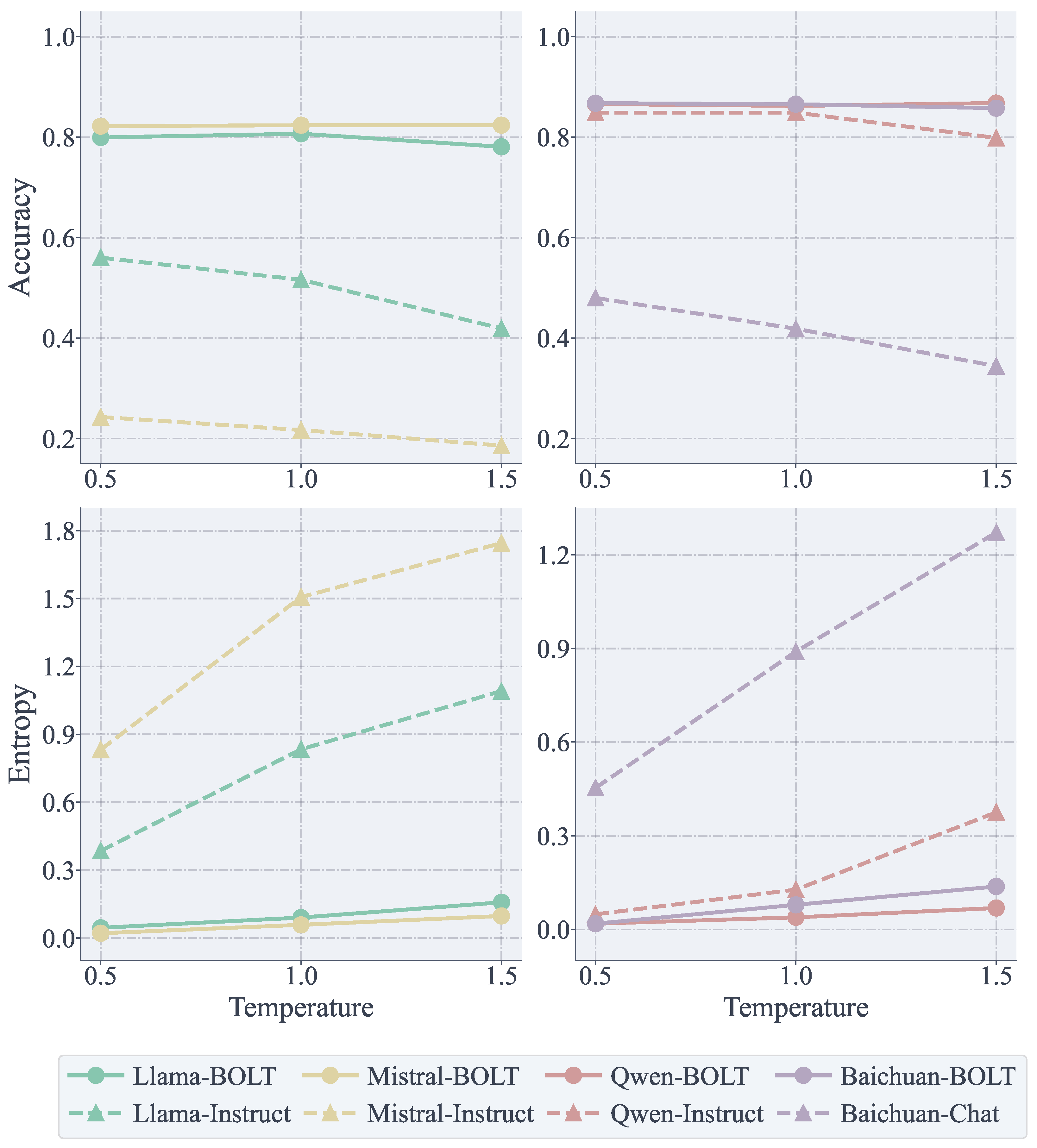 Figure 7. As the temperature increases, the accuracy of the baseline model (i.e., the officially fine-tuned version) declines, whereas the BOLT model consistently maintains high accuracy, exhibiting robustness to temperature changes. Furthermore, higher temperature settings lead to a more dispersed response distribution in the baseline model, while the BOLT model’s outputs remain notably more concentrated. These results indicate that BOLT enhances the stability of model outputs without compromising performance.