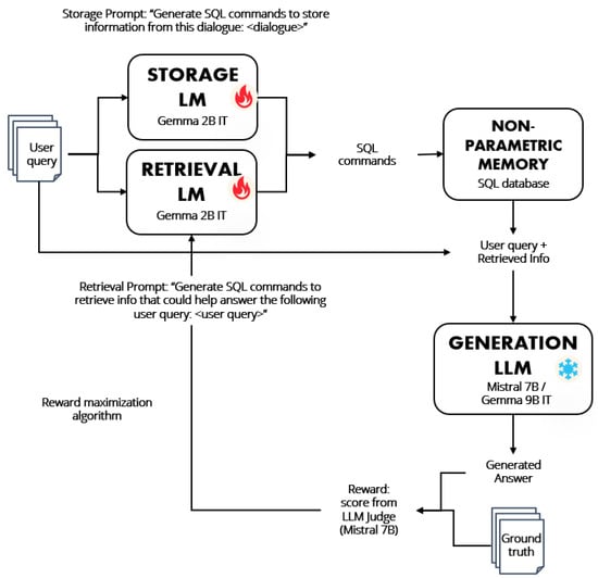 System architecture diagram showing the interaction between the generation model, the auxiliary storage and retrieval models, and the SQL database. Upon receiving a user query, the storage model is prompted to generate an SQL command to store any important new information into the SQL database. At the same time, the retrieval model is prompted to generate an SQL command to retrieve any information relevant to answering the user query. The retrieved information is passed along with the user query to the generation language model, which generates the final response. An LLM judge is used to score the accuracy of the response and the score is used as a reward signal to train the storage and retrieval models.